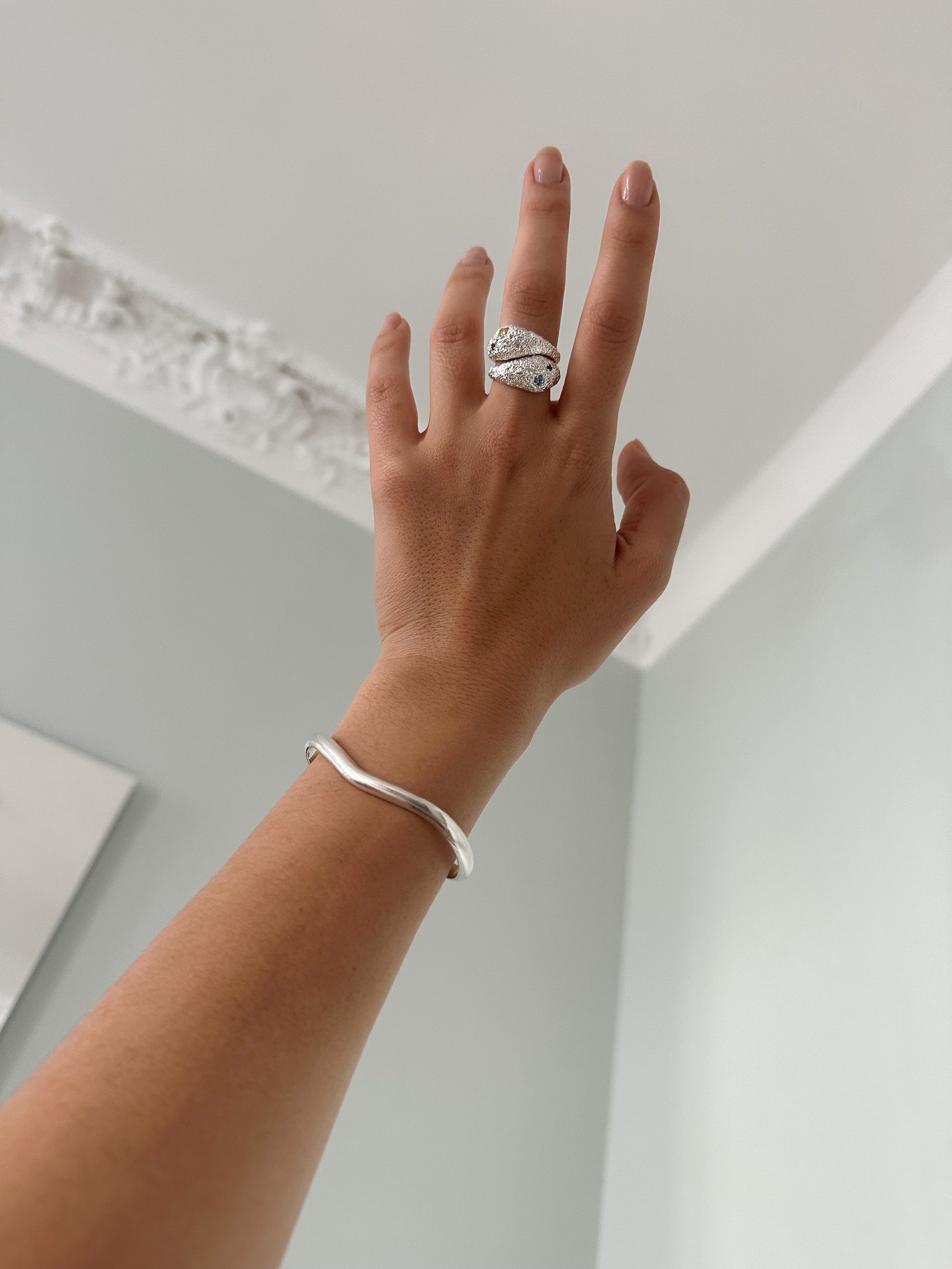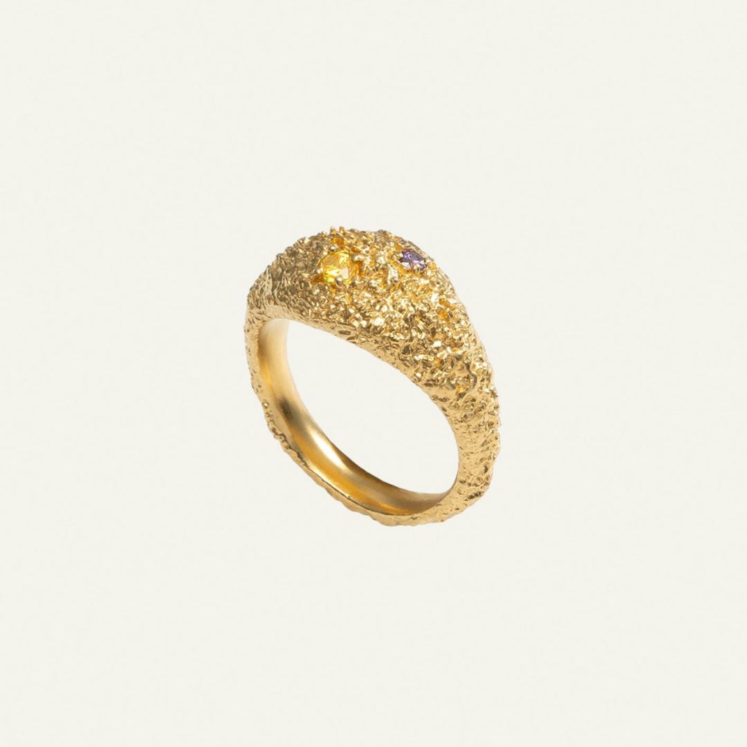 Ręcznie wykonany pierścionek z oryginalną fakturą z kamieniami oprawionymi techniką jubilerską.