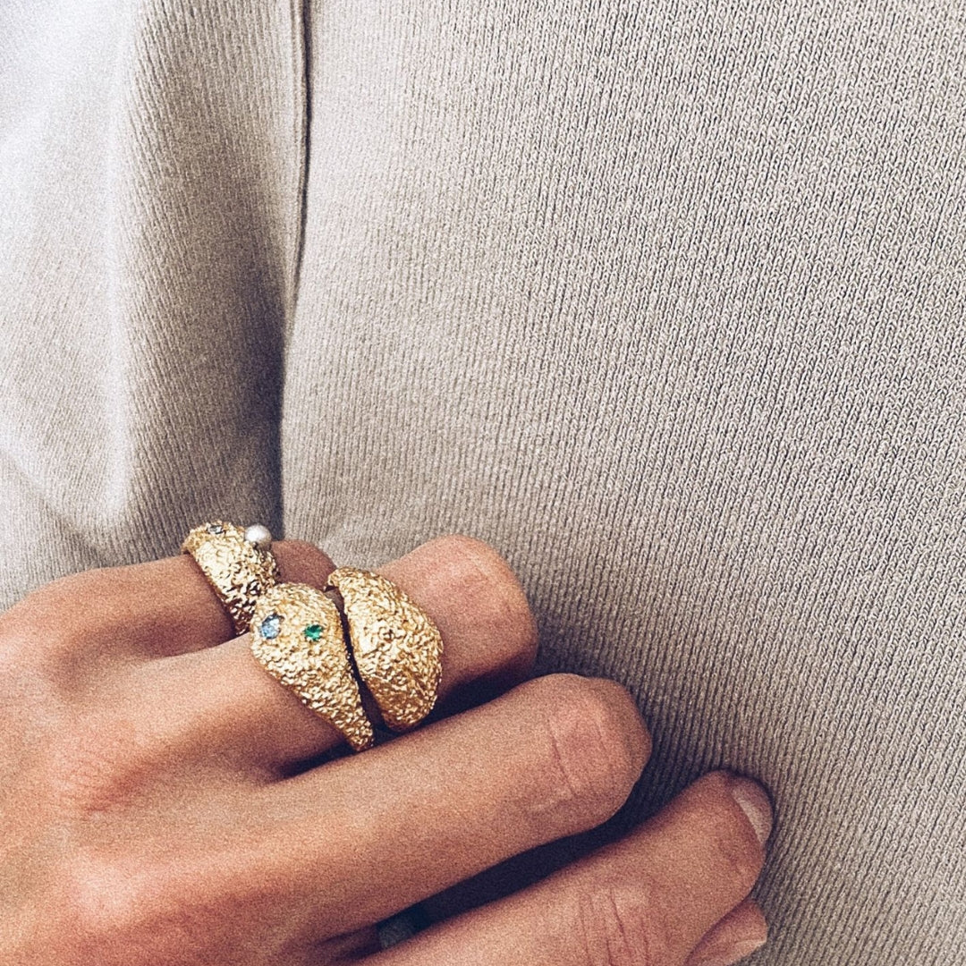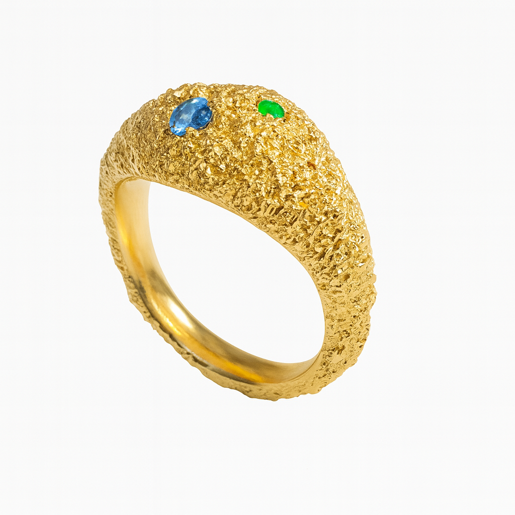 Ręcznie wykonany pierścionek z oryginalną fakturą z kamieniami oprawionymi techniką jubilerską.